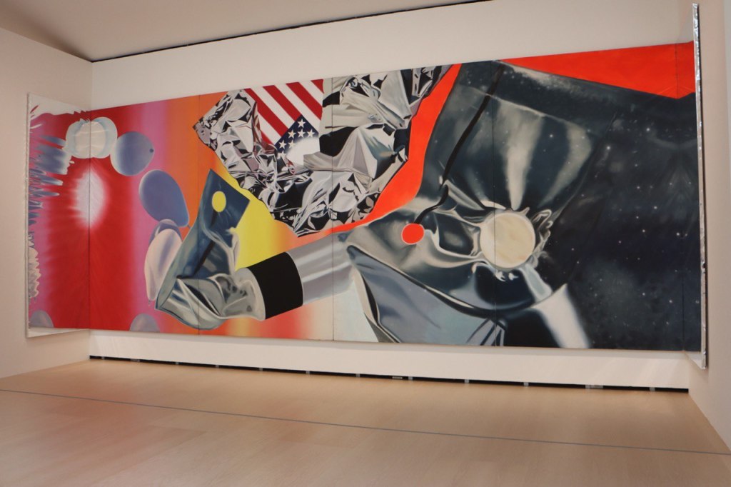 Fu proprio questo il caso della prossima opera di cui voglio parlarvi. Con “Flamingo Capsule” Rosenquist decide nel 1970 di omaggiare il programma spaziale americano Apollo I e gli astronauti tragicamente scomparsi nell’incedio del 1967 durante una prova per la missione. La giustapposizione degli oggetti e delle immagini fotografiche sulla grande tela evocano emozioni fortissime e sensazioni di vuoto esistenziale legate al vagare insensato degli oggetti presenti nella capsula spaziale tra la violenza delle fiamme. Un foglio accartocciato di un’uniforme adornata con la bandiera statunitense, un sacchetto di cibo deformato e un palloncino fluttuante. Tutto improvvisamente diventa privo di significato di fronte all’immensità e al pericolo dell’ignoto, persino il progresso tecnologico dell’uomo.