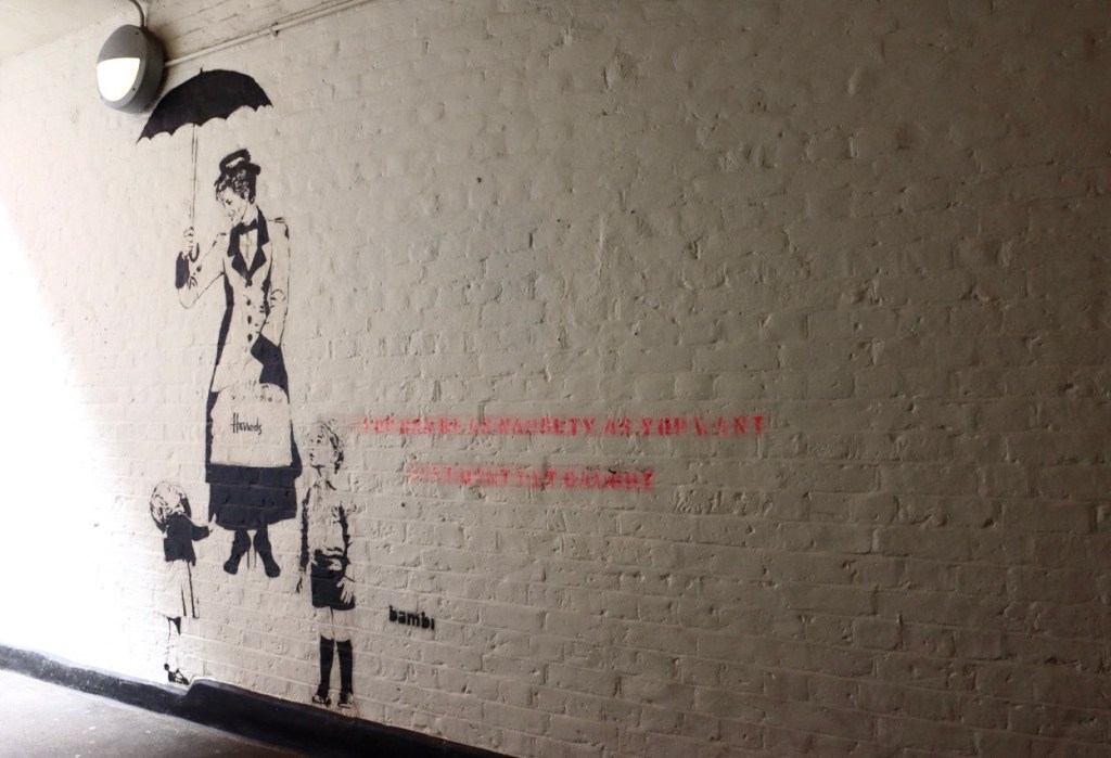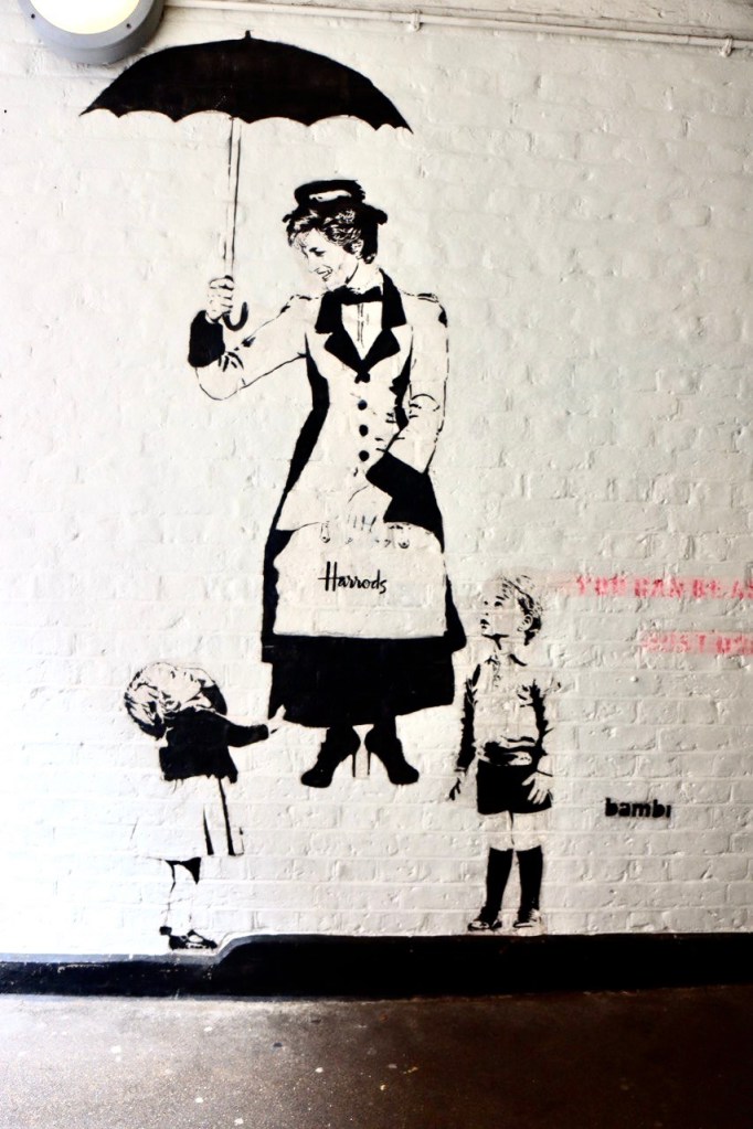 In un angolo tranquillo di Neal’s Yard, a pochi passi dal vivace Covent Garden, si trova un’opera che riesce a commuovere e far riflettere allo stesso tempo. Lì, sul muro di un vicolo poco battuto, la Principessa Diana è raffigurata nei panni di Mary Poppins mentre fluttua leggera con un ombrello e una borsa Harrods, chiaro riferimento a Dodi Al-Fayed, suo compagno, erede del celebre magazzino e vittima insieme a lei del tragico incidente del 1997.