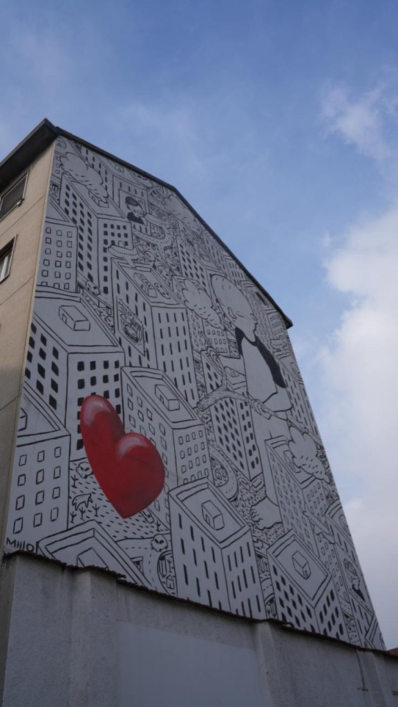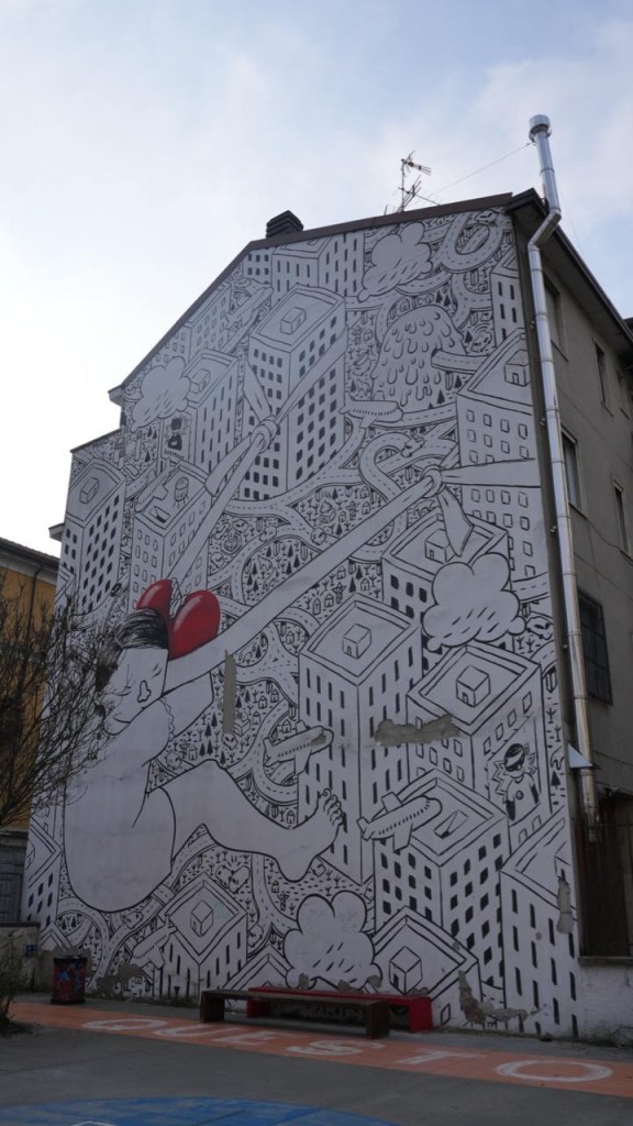 A dominare questo spazio urbano sono due enormi facciate dipinte che si affacciano sui cortili grigi circostanti. È qui che prende vita Love Seeker, l’opera realizzata nel 2015 da Millo.
