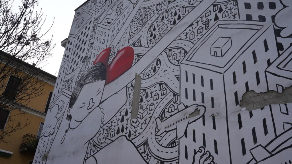 Le due pareti dialogano tra loro come pagine di una stessa storia illustrata. Il tratto è inconfondibile: bianco e nero, linee decise, città labirintiche che si sviluppano in verticale come intricati puzzle urbani. I palazzi sembrano incastrarsi uno dentro l’altro, creando un paesaggio metropolitano denso e quasi onirico.