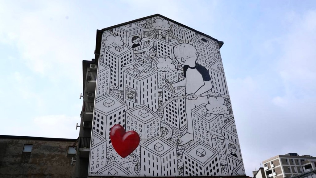 Sull’altra parete compare una figura femminile altrettanto monumentale che lancia un cuore con una fionda. Nel contesto monocromatico della città, i due cuori rossi, intensi e tridimensionali, sono gli unici elementi a colori, simboli di autenticità e di desiderio di connessione in mezzo a un intreccio fitto e caotico di modernità, frenesia quotidiana e solitudine.